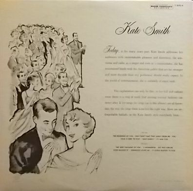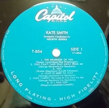 米キャピトル、モノラル盤T854<BR>54年録音<BR>戦前からラジオとテレビで活躍、コメンテーターとしても才能を発揮した歌手、ケイト・スミスがキャピトルに吹き込んだ逸品。<BR>ネルソン・リドルのオーケストラをバックにふくよかな歌声でしっとりとスタンダード・ナンバーを歌い上げています。<BR>ノスタルジックな雰囲気さえ漂う傑作。<BR>レーベルは57年から58年まで使用されたターコイズ・レーベル。<BR>カンパニー・スリーヴ付き。<BR><BR>The Nearness Of You <BR>They Can't Take That Away From Me<BR>You<BR>Love Is Here To Stay<BR>Who Cares?<BR>If I Had You<BR>The Very Thought Of You<BR>S'Wonderful<BR>But Not For Me<BR>Love Walked In<BR>Somebody Loves Me<BR>It Could Happen To You<BR><BR>ジャケットには若干の擦れ、裏面が多少黄ばんでいて左下に薄い染み痕がある以外は良好です。<BR>盤質良好です。