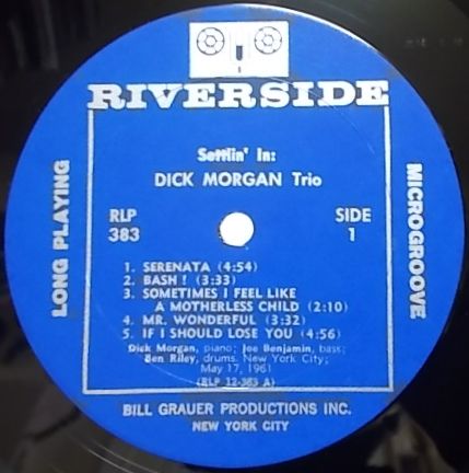 米リバーサイド、モノラル盤RLP383<BR>61年録音<BR>キャノンボール・アダレイに認められリバーサイドからデビューしたデヴァージニア州出身のピアニスト、ディック・モーガンの3枚目のリーダー作。<BR>「アット・ザ・ショーボート」、「シー・ホワット・アイ・ミーン」に続く作品で、今回は脇を固めるリズム隊がジョー・ベンジャミンとベン・ライリーのベテランに交替。<BR>オリジナル・ナンバー2曲を除いてスタンダードが並んでいますが、中でも恩人であるキャノンボール・アダレイの演奏で大ヒットしたナット・アダレイ作の「ワークソング」を取り上げているのが目を引きます。<BR>ディック・モーガンのスィンギーかつファンキーなピアノが楽しめる隠れた名盤。<BR>レーベルはオリジナルの大レーベル。<BR><BR>Dick Morgan (p)<BR>Joe Benjamin (b)<BR>Ben Riley (ds)<BR><BR>Serenata<BR>Bash!<BR>Sometimes I Feel Like A Motherless Child<BR>Mr. Wonderful<BR>If I Should Lose You<BR>Settlin' In<BR>Take The "A" Train<BR>Work Song<BR>I'll Take Romance<BR>Just In Time<BR><BR>テキスチャード・ジャケットの左端近くにいくつかの剥がれ、背と角に擦れと傷み、裏面が若干黄ばんでいる以外は良好です。<BR>盤には数本の擦れがある以外は良好です。