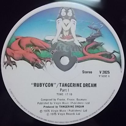英ヴァージン盤V2025<BR>75年録音<BR>ヴァージン移籍第一弾である「フェードラ」が英アルバム・チャートの15位を記録しましたが続く第二弾となる通算では6作目となる本作はタンジェリン・ドリーム中期の代表作。<BR>本作は更に英アルバム・チャートの12位を記録、シンセサイザー・ミュージックのトップ・グループの座に躍り出た、金字塔と呼べる記念すべき作品。<BR>感傷的でもある甘さを排した揺るぎない構築とリズミックで、単調とも思える反復を計算された鼓動へと高めていく様は圧巻。<BR>マトリックスはV2025A-2とB-1U<BR><BR>Edgar Froese (g, mellotron syn)<BR>Peter Baumann (org, syn, el-p, p,, voice)<BR>Chris Franke (syn, org, p, gong)<BR><BR>Rubycon (part 1)<BR>Rubycon (part 2)<BR><BR>全面がコーティングされた見開きジャケットは右上角に軽い折れがある以外は良好です。<BR>盤質良好です。