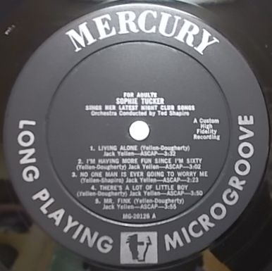 米マーキュリー、モノラル盤MG20126<BR>56年発売<BR>ヴォードビルの女王または最後のレッド・ホット・ママと呼ばれ、主に20年代に活躍したロシア出身の歌手、ソフィー・タッカーの作品。<BR>若くしてニューヨークのショー・ビジネス界、主にナイトクラブ、キャバレー、バーレスク、ヴォードヴィルの世界で情熱溢れる、華麗で独特のスタイルの歌が持ち味。<BR>ブロードウエイはもとより映画、ラジオ、テレビ等でも大活躍しただけあってその表現力は豊かで語りかけるように説得力のある歌唱は実に魅力的。<BR>Deep Groove<BR><BR>Living Alone<BR>I'm Having More Fun Since I'm Sixty<BR>No One Man Is Ever Going To Worry Me<BR>There's A Lot Of Little Boy<BR>Mr. Fink<BR>No One Woman Can Satisfy Any One Man All The Time<BR>How Am I Ever Going To Grow Old?<BR>Mama Goes Where Papa Go (English Version) <BR>Mama Goes Where Papa Go (Yiddish Version)<BR>You Can't Deep Freeze A Red Hot Mama<BR>I'm Starting All Over Again<BR><BR>コーティング・ジャケットの底割れ3センチ半は修復済み、裏面が黄ばんでいて右上にシールを剥がした痕がある以外は良好です。<BR>盤質良好です。