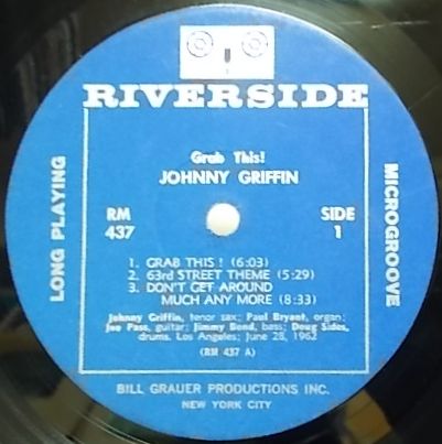 米リバーサイド、モノラル盤RM437<BR>62年録音<BR>チャーリー・パーカー、ドン・バイアスの流れをくむテナー奏者、ジョニー・グリフィンのリバーサイドにおける9作目。<BR>西海岸を楽旅していたマイルス・バンドのリズム隊を含むウエス・モンゴメリーの「フル・ハウス」にジョニー・グリフィンが客演した翌日の録音。<BR>役者としても活躍していた異色オルガン奏者、ポール・ブライアント、西海岸を代表するギタリストのジョー・パス等人選も興味深く、非常にリラックスした演奏内容。<BR><BR>Johnny Griffin (ts)<BR>Joe Pass (g)<BR>Paul Bryant (org)<BR>Jimmy Bond (b)<BR>Doug Sides (ds)<BR><BR>Grab This!<BR>63rd Street Theme<BR>Don't Get Around Much Any More<BR>Offering Time<BR>These Foolish Things<BR>Cherry Float <BR><BR>ジャケットの裏面が若干黄ばんでいて上部に落書きがある以外は良好です。<BR>盤の数ヶ所にすり傷と傷がありところどころでチリパチノイズ、たまにパチノイズがする以外は良好です。