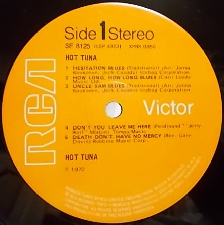 英RCA盤SF8125<BR>69年録音<BR>ジェファーソン・エアプレーンのヨーマ・コーコネンとジャック・キャシディによるサイド・プロジェクト、ホット・ツナの鮮烈なデビュー作。<BR>彼らのルーツであるカントリー・ブルースを基本であるドラムレス、ハーモニカ入りの白熱のアンプラグド・ライブ演奏。<BR>オリジナル・ナンバーは最後の2曲のみで、トラディショナル・ブルースを始め、リロイ・カー、ブラインド・ゲイリー・デイビス、果てはスイング・ジャズ・ピアニストのジェリー・ロール・モートンの曲までをもカバーしています。<BR>派手さはないものの三人の力量に圧倒される聴き応えある逸品。<BR>レーベルはオリジナルのニス塗りオレンジ・レーベル。<BR>マトリックスはXPRS0650-1E と 0651-1Eのファースト・プレス。<BR><BR>Jorma Kaukonen (g, vo)<BR>Jack Casady (b)<BR>Will Scarlett (harmonica)<BR><BR>Hesitation Blues<BR>How Long Blues<BR>Uncle Sam Blues<BR>Don't You Leave Me Here<BR>Death Don't Have No Mercy<BR>Know You Rider<BR>Oh, Lord, Search My Heart<BR>Winin' Boy Blues<BR>New Song (For The Morning)<BR>Mann's Fate<BR><BR>ジャケットには軽いリングウエア、天、角と底に擦れがある以外は良好です。<BR>盤質良好です。