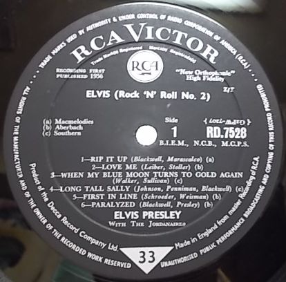 英RCAビクター、モノラル盤RD7528<BR>56年録音<BR>同年大ヒットした シングル「Don't Be Cruel c/w Hound Dog」の勢いも手伝ってかエルヴィス・プレスリーの二作目は4週目でビルボードの一位を獲得するヒット。<BR>シングルカットされた「Love Me」はビルボードの第二位と健闘。<BR>「Rip It Up」や「Long Tall Sally」等のロカビリー系のアップテンポの曲に混じって「First in Line」、「How's The World Treating You」等のカントリーっぽい曲を巧みに取り上げ新しい、幅広い音楽性を見せ始め、極上のバラード「Old Shep」等はエルヴィスならでは。<BR>デッカ・プレスのレーベルにはRecording First Published 1956、タックス・コードはZ/T。<BR>マトリックスはG2WP-7207-1Bと7208-1B<BR>Deep Groove<BR><BR>Elvis Presley (vo, g, p)<BR>Scotty Moore (g)<BR>Shorty Long (p)<BR>Gordon Stoker (p) <BR>Bill Black (b)<BR>D.J. Fontana (ds)<BR>The Jordanaires (backing vo)<BR><BR>Rip It Up<BR>Love Me<BR>When My Blue Moon Turns to Gold Again<BR>Long Tall Sally<BR>First in Line<BR>Paralyzed<BR>So Glad You're Mine<BR>Old Shep<BR>Ready Teddy<BR>Anyplace Is Paradise<BR>How's the World Treating You<BR>How Do You Think I Feel<BR><BR>フリップバックのコーティング・ジャケットは黄ばんでいて裏面右上にシールがある以外は良好です。<BR>盤質良好ですがたまにチリノイズがします。