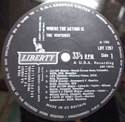 英リバティ、モノラル盤LBY1297<BR>66年録音<BR>60年に「Walk Don't Run」でデビューして以来半年に一枚(どころか2、3ヶ月に一枚のことも)のペースで新作をリリースし続けたベンチャーズの脂の乗ってる時期の作品。<BR>「Action」、「Taste of Honey」、「Nutty」等ソリッドなギター・サウンドが楽しめる逸品で、「Hang On Sloopy」等は手放しで楽しめ、日本でのエレキ・ブームの立役者になり、また英国ではモッズ・グループにも多大な影響を与えます。<BR>EMIのカンパニー・スリーヴ付き。<BR>マトリックスはLBY1297A-1とB-1<BR><BR>Action<BR>Lies<BR>Fever<BR>Stop Action<BR>3's A Crowd<BR>A Taste of Honey<BR>No Matter What Shape<BR>Action Plus<BR>Hang on Sloopy<BR>Nutty<BR>Little Bit of Action<BR>She's Just My Style<BR><BR>フリップ・バックのコーティング・ジャケットは右上角に潰れと皺、数ヶ所に皺、裏面が若干黄ばんでいて右上にスタンプがある以外は良好です。<BR>盤には細い傷がA6にあり数回チリパチノイズがする以外は良好です。